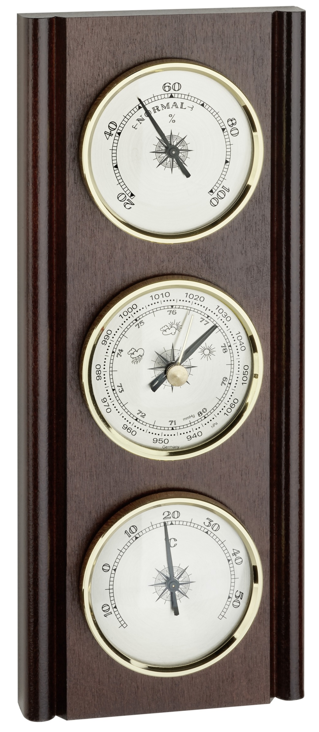 Meteostanice obsahuje barometr, vlhkoměr a teploměr - všechny přístroje jsou o průměru 70 mm.
